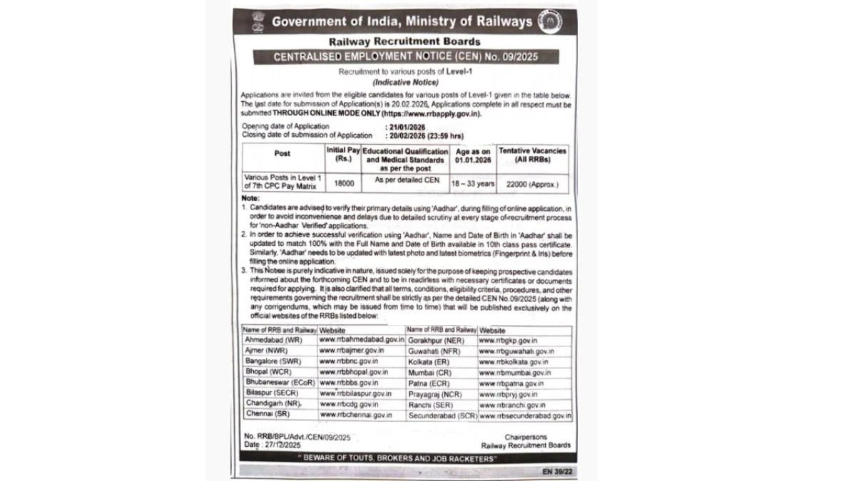 आवेदन जमा करने की अंतिम तिथि 14.06.2026 है। सभी प्रकार से पूर्ण आवेदन केवल ऑनलाइन माध्यम से ही जमा किए जाने चाहिए वेबसाइट –https://www.rrbapply.gov.in